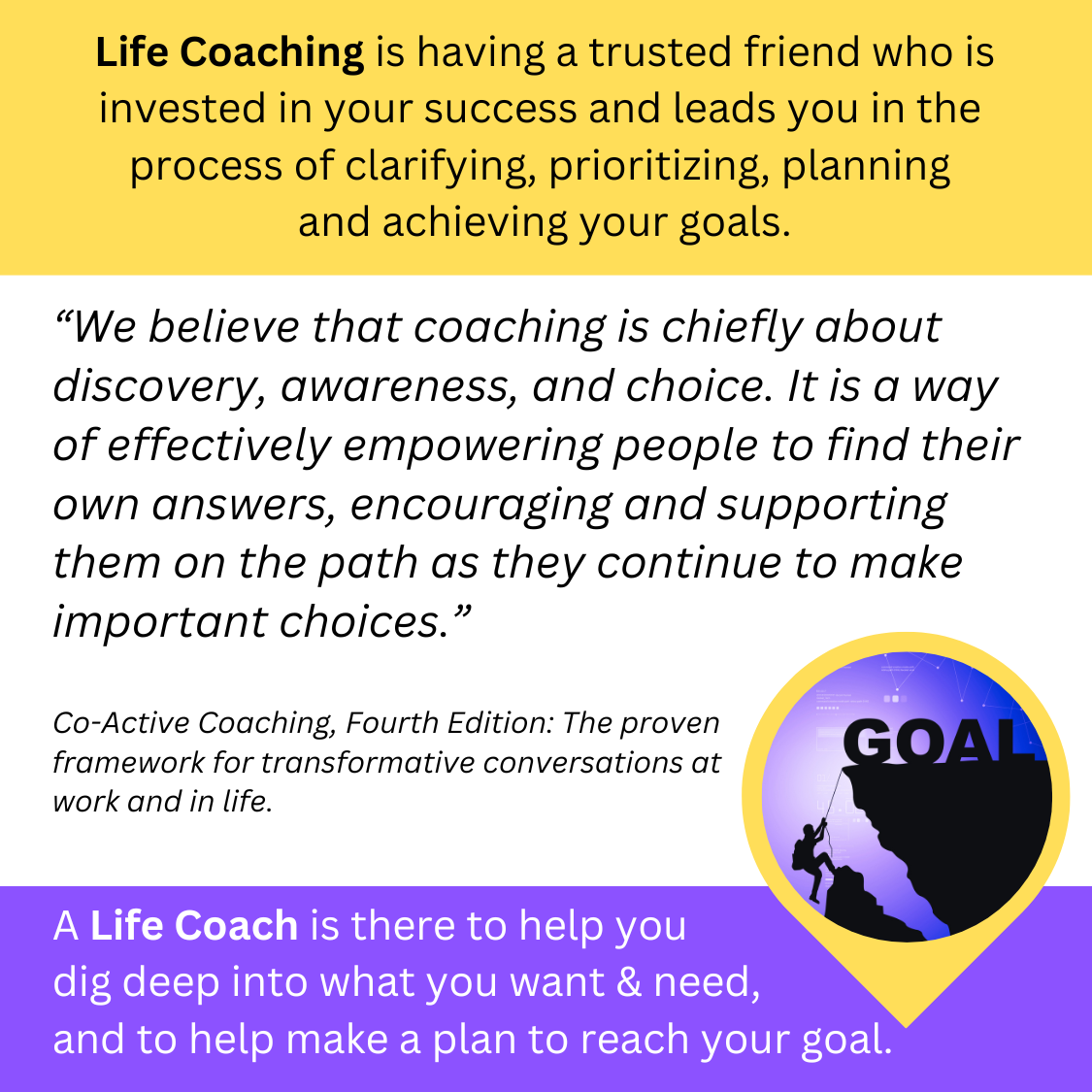 Life Coaching is nothing like having a sports coach or a professional coach, except that we’re identifying and working towards goals you identify as important. As a life coach I’m going to help you clarify your needs and desires, chart a course of change, and create achievable steps to arrive at the goal; you’ll refine your ability to reflect and to make decisions. Life coaching can be transformative when considering and planning major changes and transitions in life.