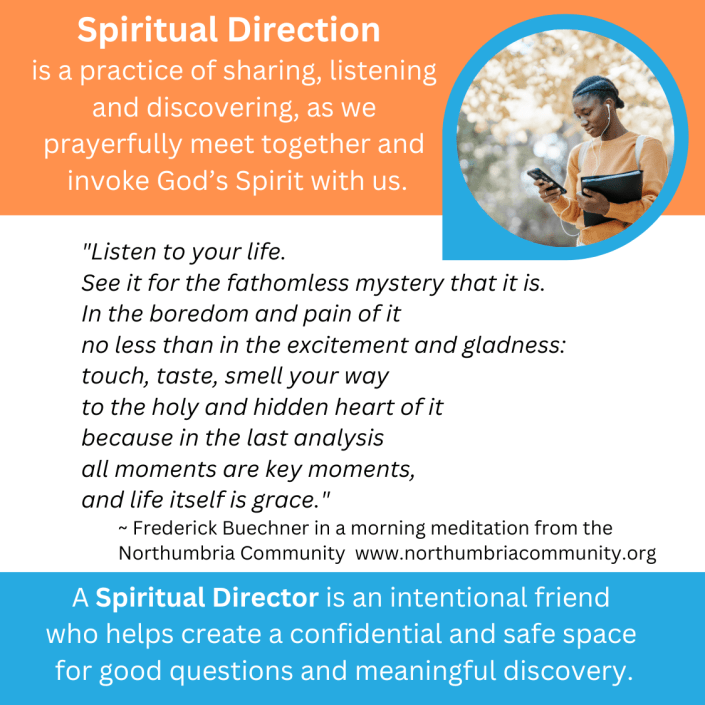 As a spiritual director I’m a trustworthy friend who is interested in listening for where God is showing up in your spirit and life. Together we’ll pray and dig into the interior life, process what nudges we feel from the Spirit of God, and ultimately see where God leads us; it’s never just two of us, but we’re joined by God’s Spirit. We’ll meet once a month for an hour for an agreed upon six or so months, with maybe a text or email between sessions when needed.