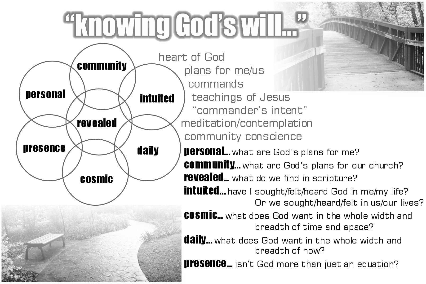 Anyway… look the matrix over and throw me any suggestions. Here’s a brief explanation of it I’ll be sharing on Sunday morning… “The chart is my attempt to gather my thoughts on moving forward with, knowing and entering into God’s will in life. The seven circles are representative of the ways I have thought of God’s will being accessible to us and the different applications of that divine will, and their interdependence (over-lapping). To the side of the circles I tried to describe the “avenues of knowing” or the scope in which we seek and apply that will. I also brainstormed a short list of concepts, activities, hopes and implications of God’s will… we’ll talk about these and more as we process this together, leave the matrix behind and approach a type of “solution.”