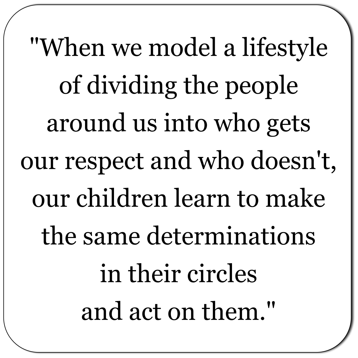 When we model a lifestyle of dividing the people around us into who gets our respect and who doesn’t, our children learn to make the same determinations in their circles and act on them. And let’s be honest, we’re talking about the words we use and the actions we take, but also about the media which we allow into our homes. Media and shows which engender fear, division, hatred or anger should have no place among our families. We can get our news, regardless of our political and social leanings, without subjecting our children to thinly veiled bigotry and divisiveness.