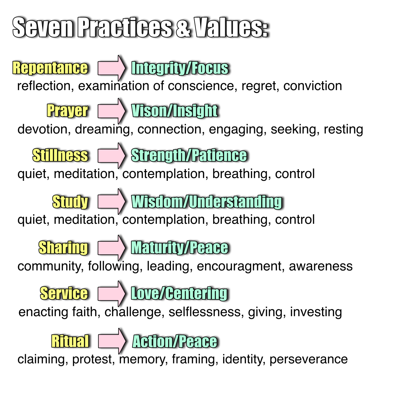 The seven practices are repentance, prayer, stillness, study, sharing, service and ritual. Within the seven practices I tried to imagine the corresponding values or virtues they cultivate in life, things like integrity, vision, strength, wisdom, maturity, love and action.
